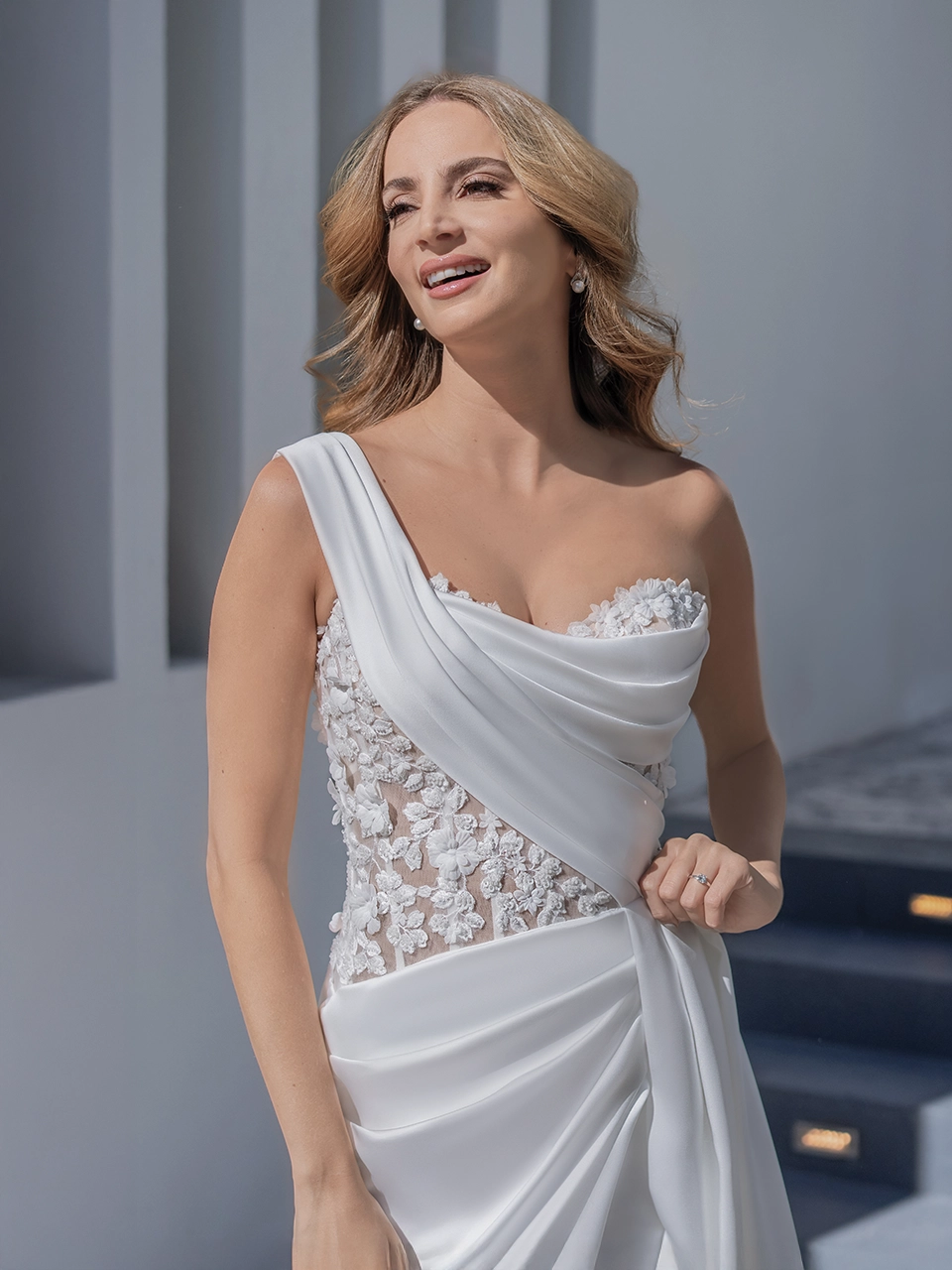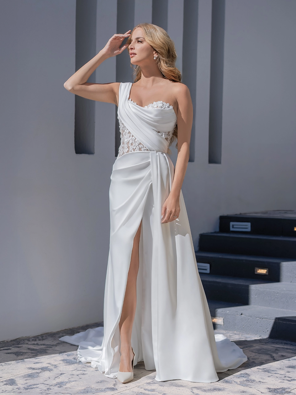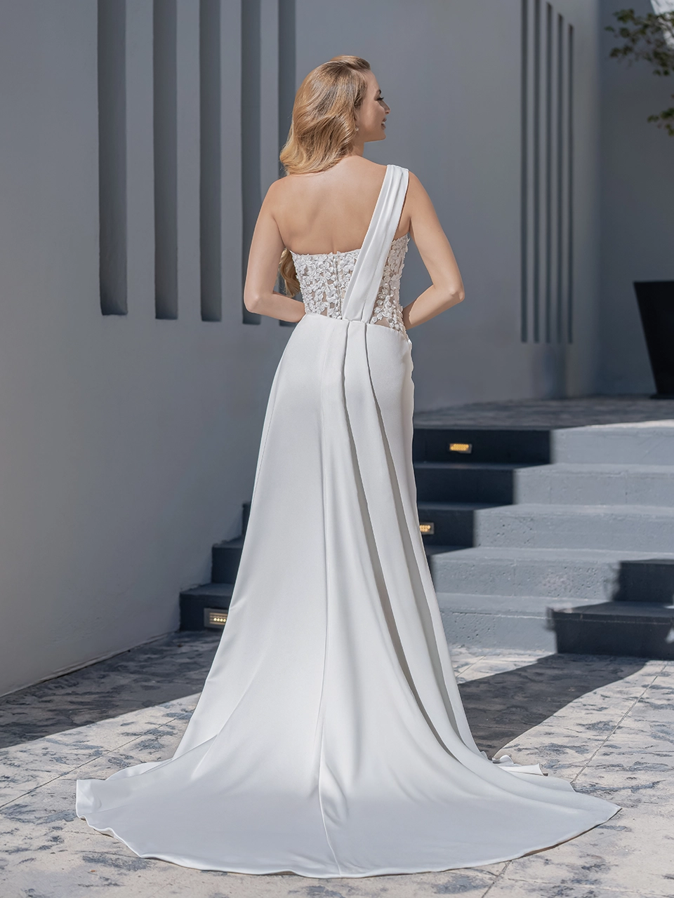 ARIADNE es un estilo perfecto para verte como una novia única y moderna. Es un bello vestido en corte línea A, con una abertura lateral atrevida. También lleva un escote asimétrico. Está confeccionado en crepé.