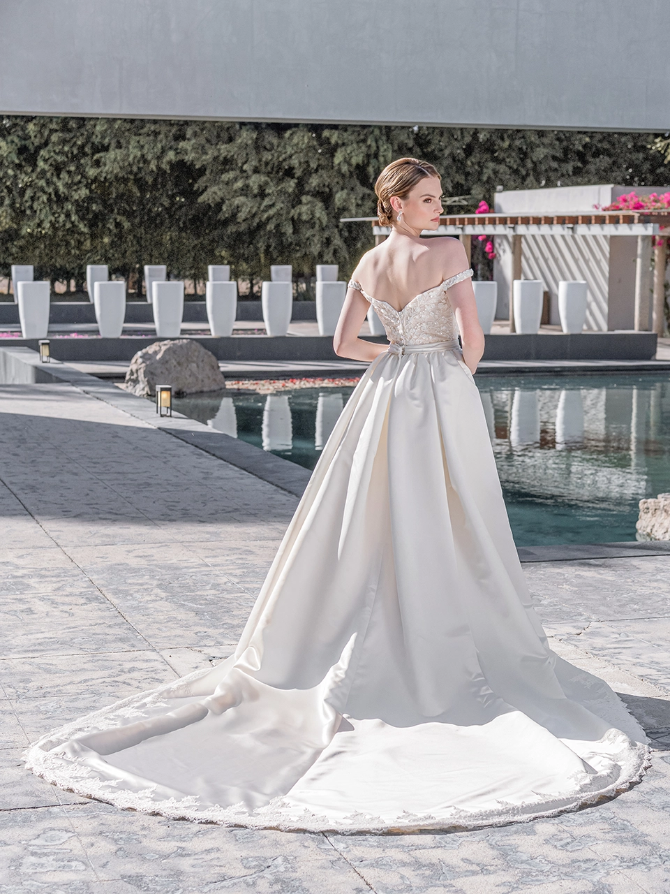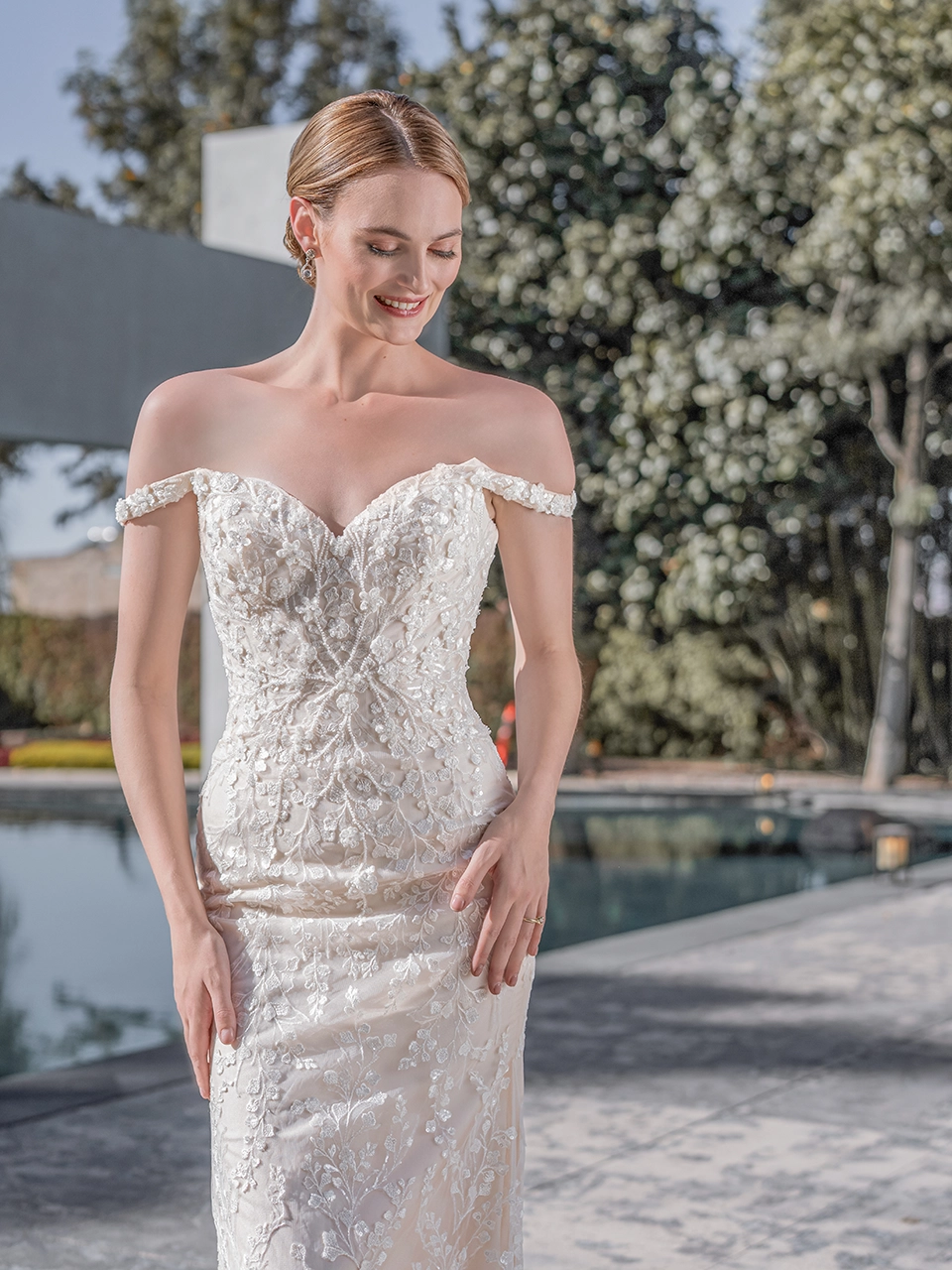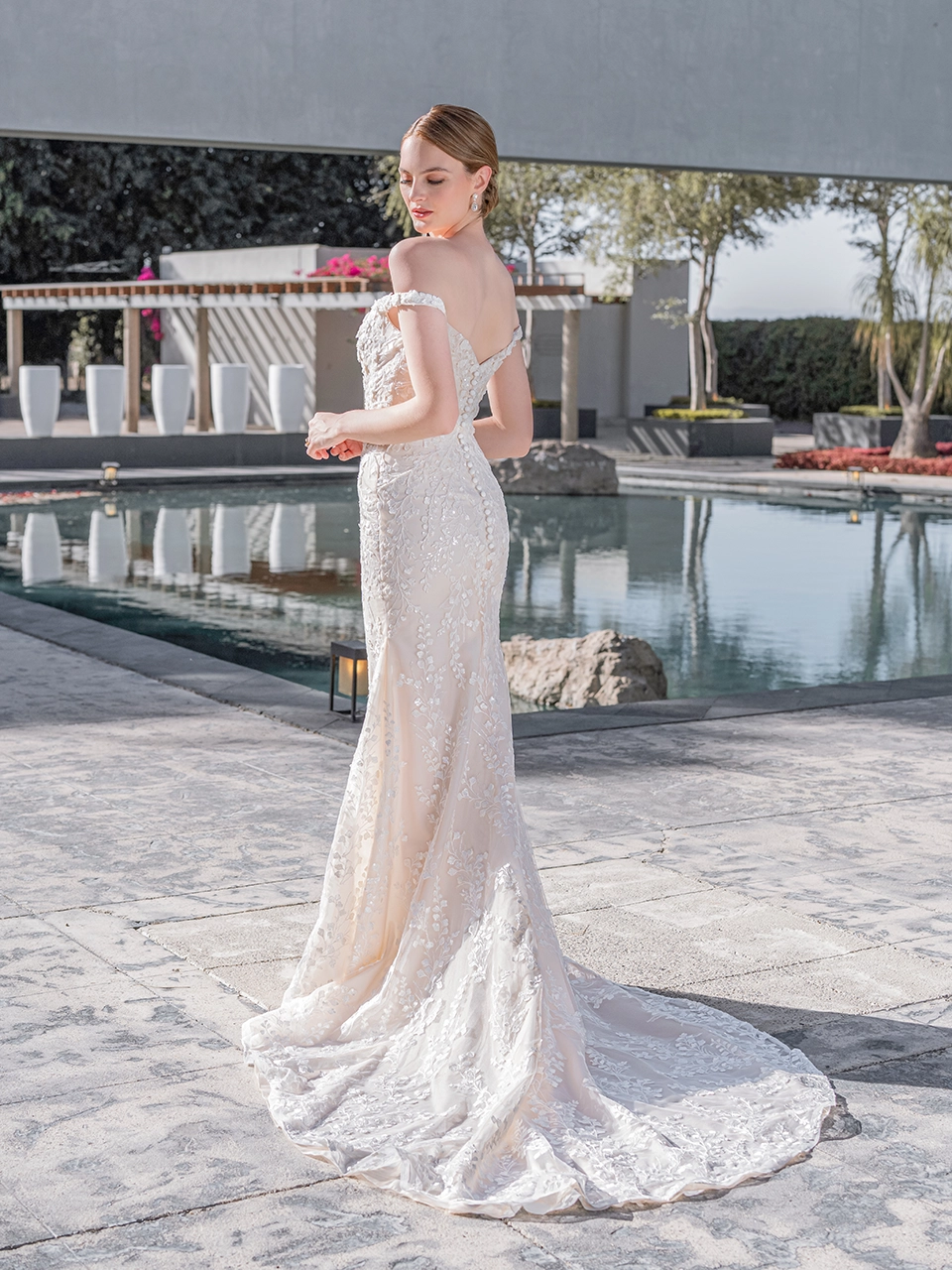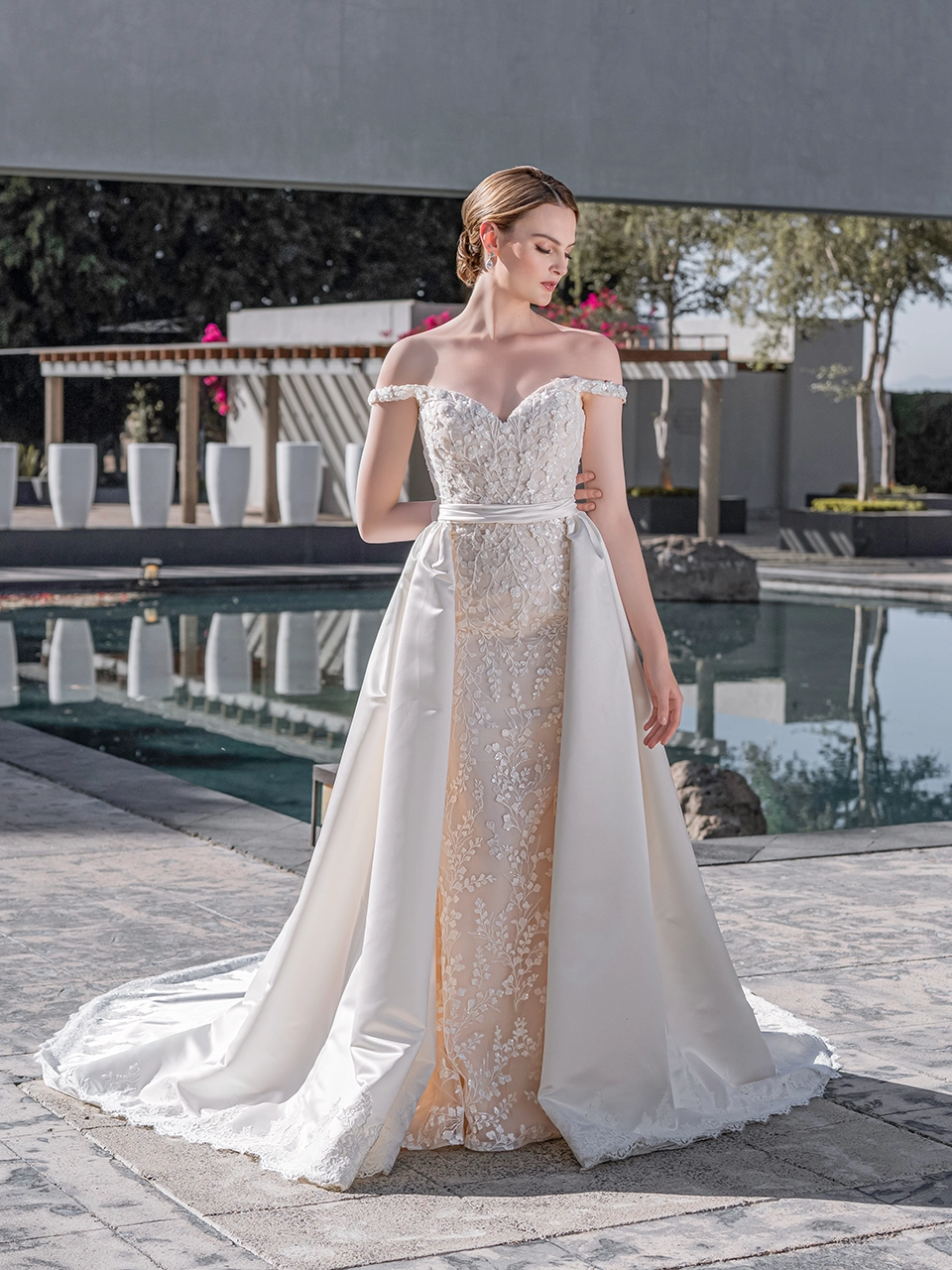 ECHO es un hermoso modelo corte sirena confeccionado en tul, cuenta con detalles de encaje, lentejuela y pedrería que te hará brillar en tu gran día. Además de eso, incluye una sobrefalda confeccionada en raso, que le dará a tu vestido una sensación de línea A, perfecto para llevar dos looks distintos en tu boda.