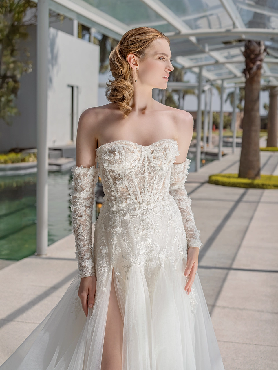 Vestido corte línea A, con un escote palabra de honor y espalda media. Está confeccionado en tul y lleva detalles de flores 3D bordadas.