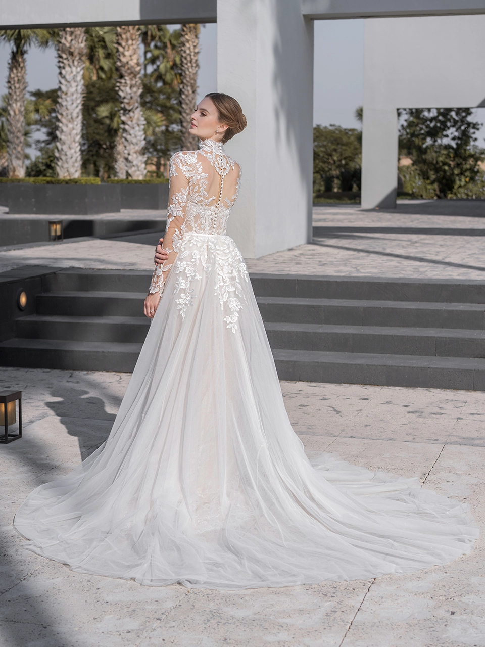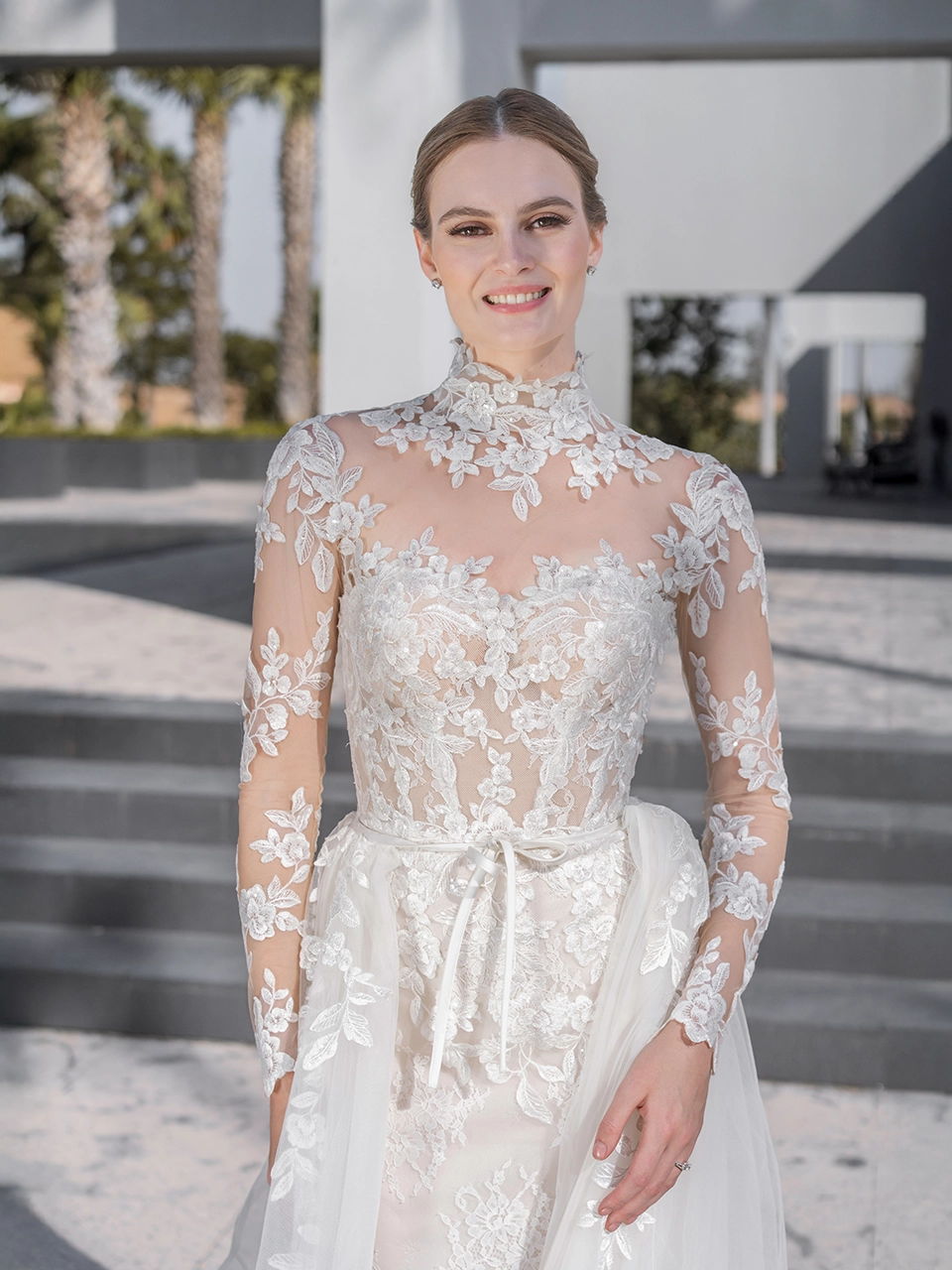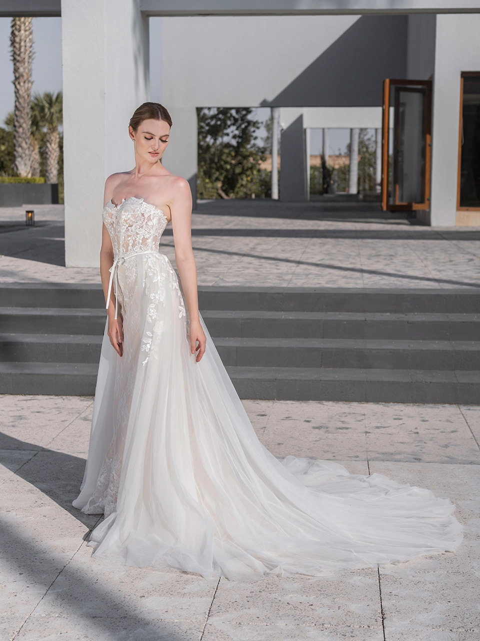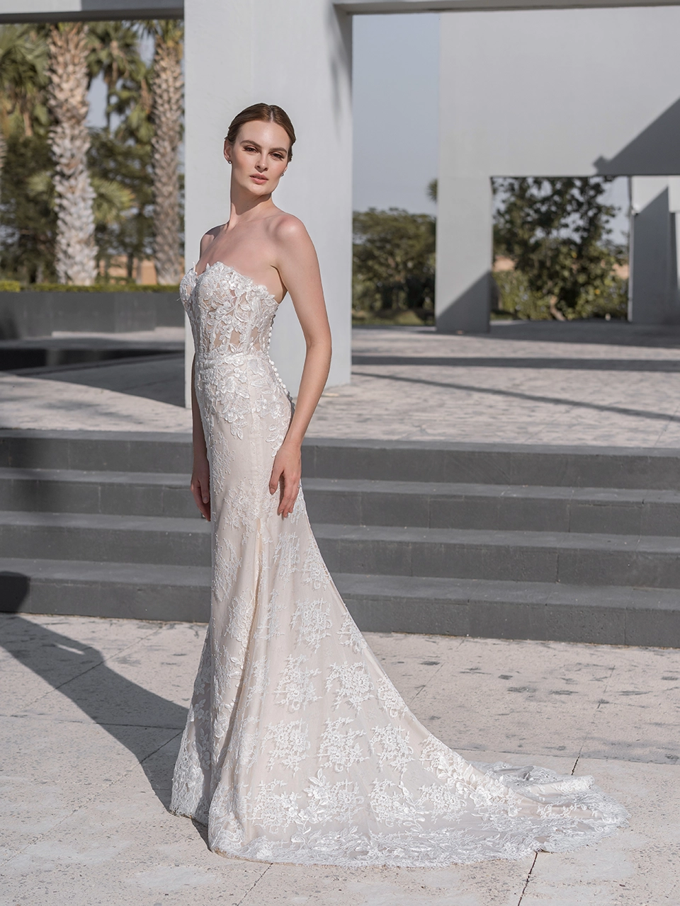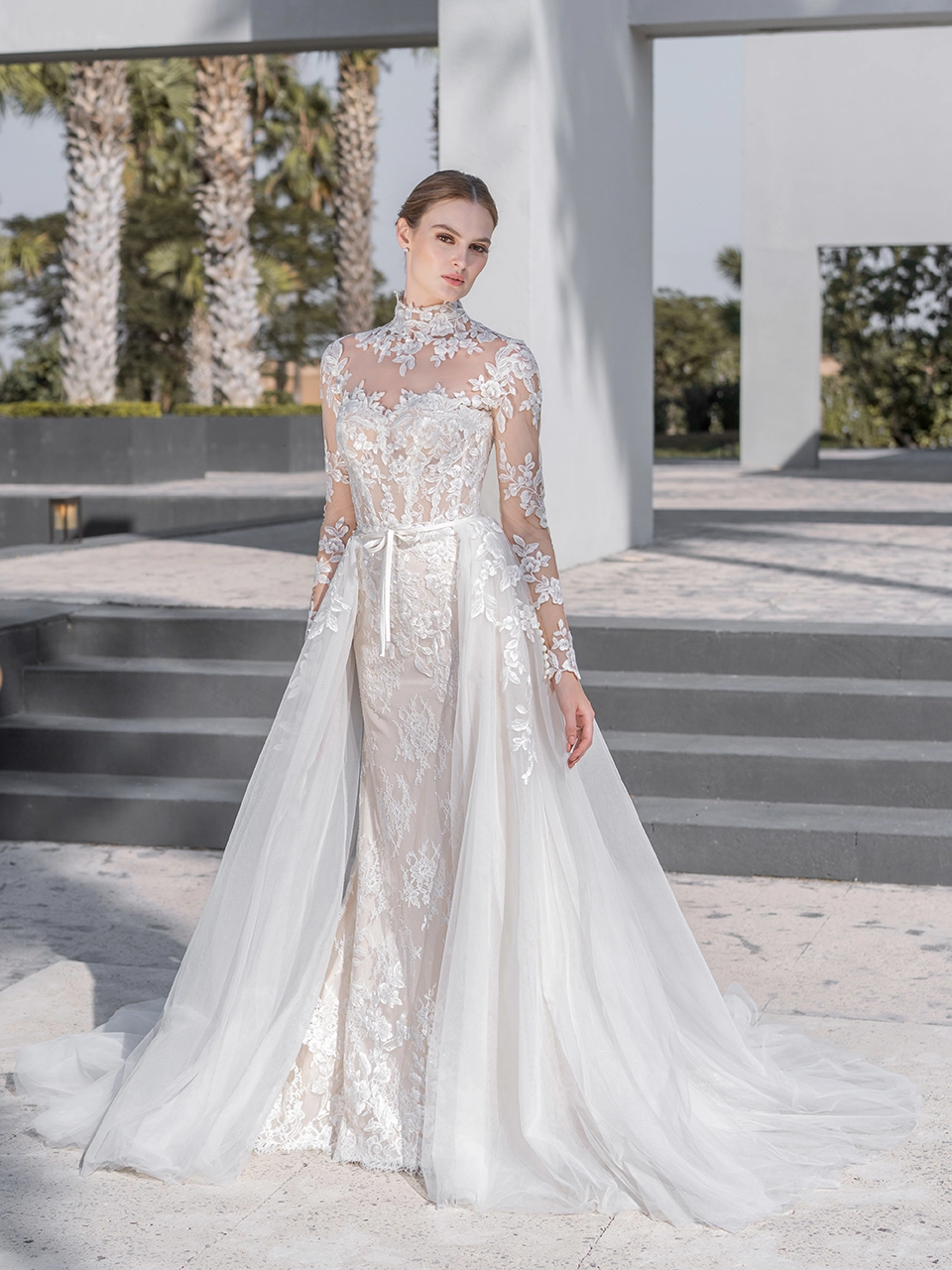 PEONY se convertirá en el vestido de tus sueños. Es un modelo corte sirena con escote en forma de corazón. Está confeccionado en chantilly y tul y está decorado con aplicaciones bordadas que le dan un toque único. Además de eso, cuenta con una cauda sobrepuesta que te hará lucir como si usarás dos vestidos diferentes. ¡Es perfecto para ti!