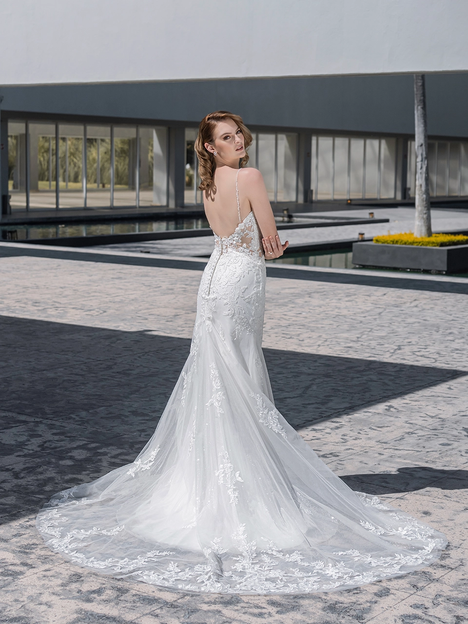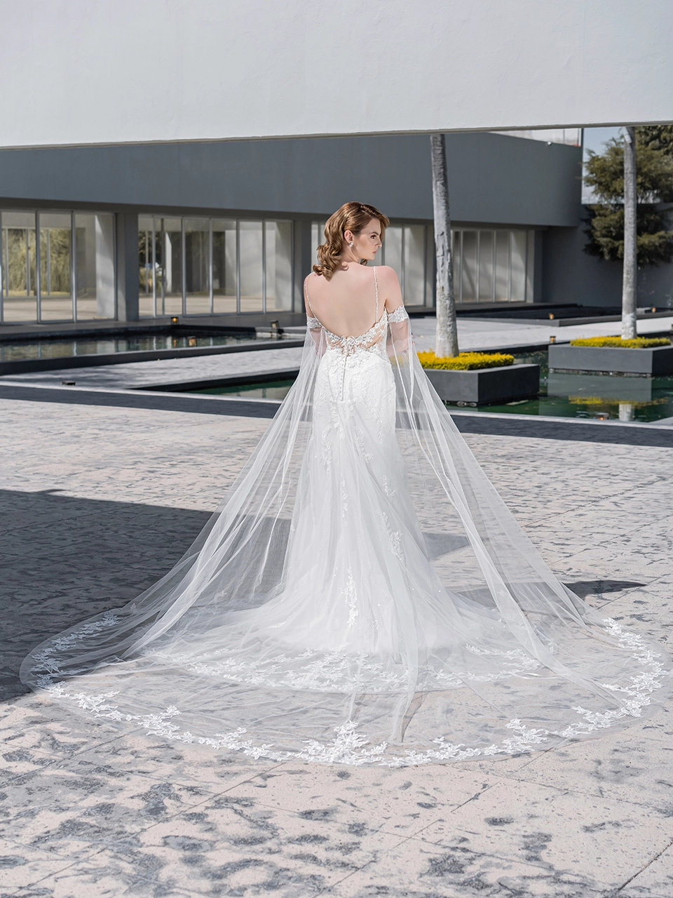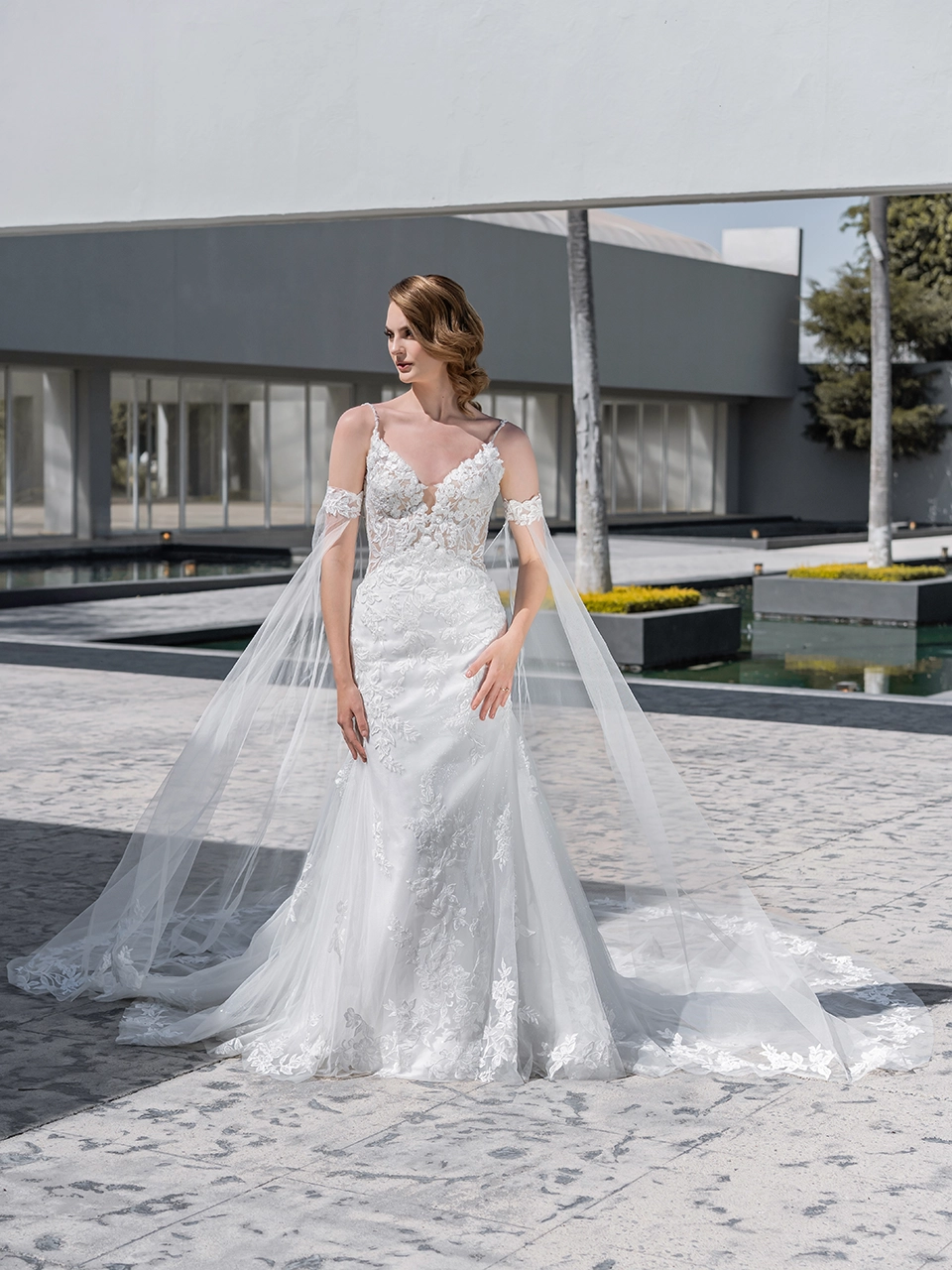 POLINA se convertirá en el vestido de tus sueños. Es un modelo corte sirena, con un escote en forma de V. Está confeccionado en tul glitter y lleva aplicaciones bordadas en todo el vestido. Lleva mangas largas desmontables que se convierten en una capa y le da un toque de cuento de hadas a tu vestido. ¡Lo amarás por completo!