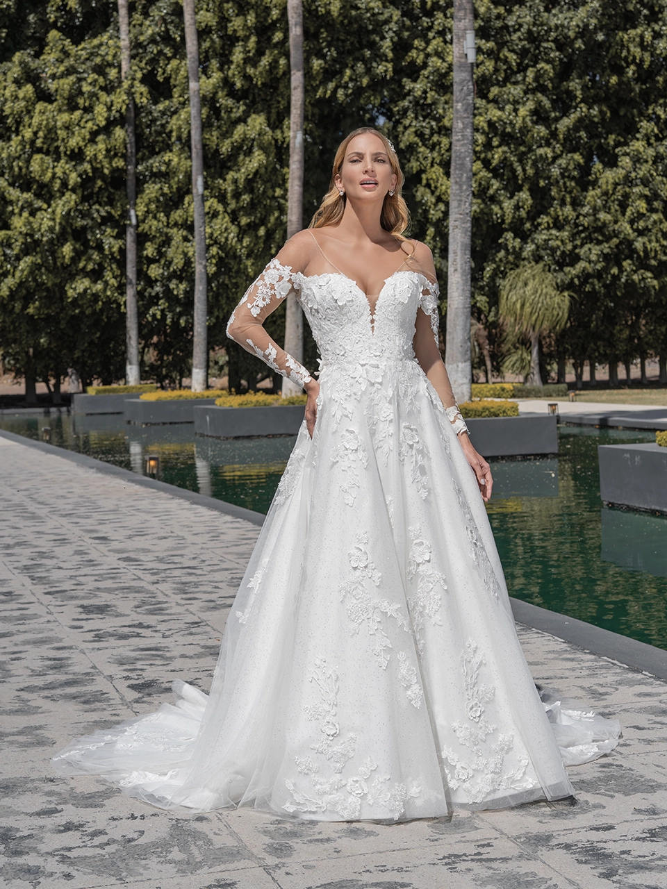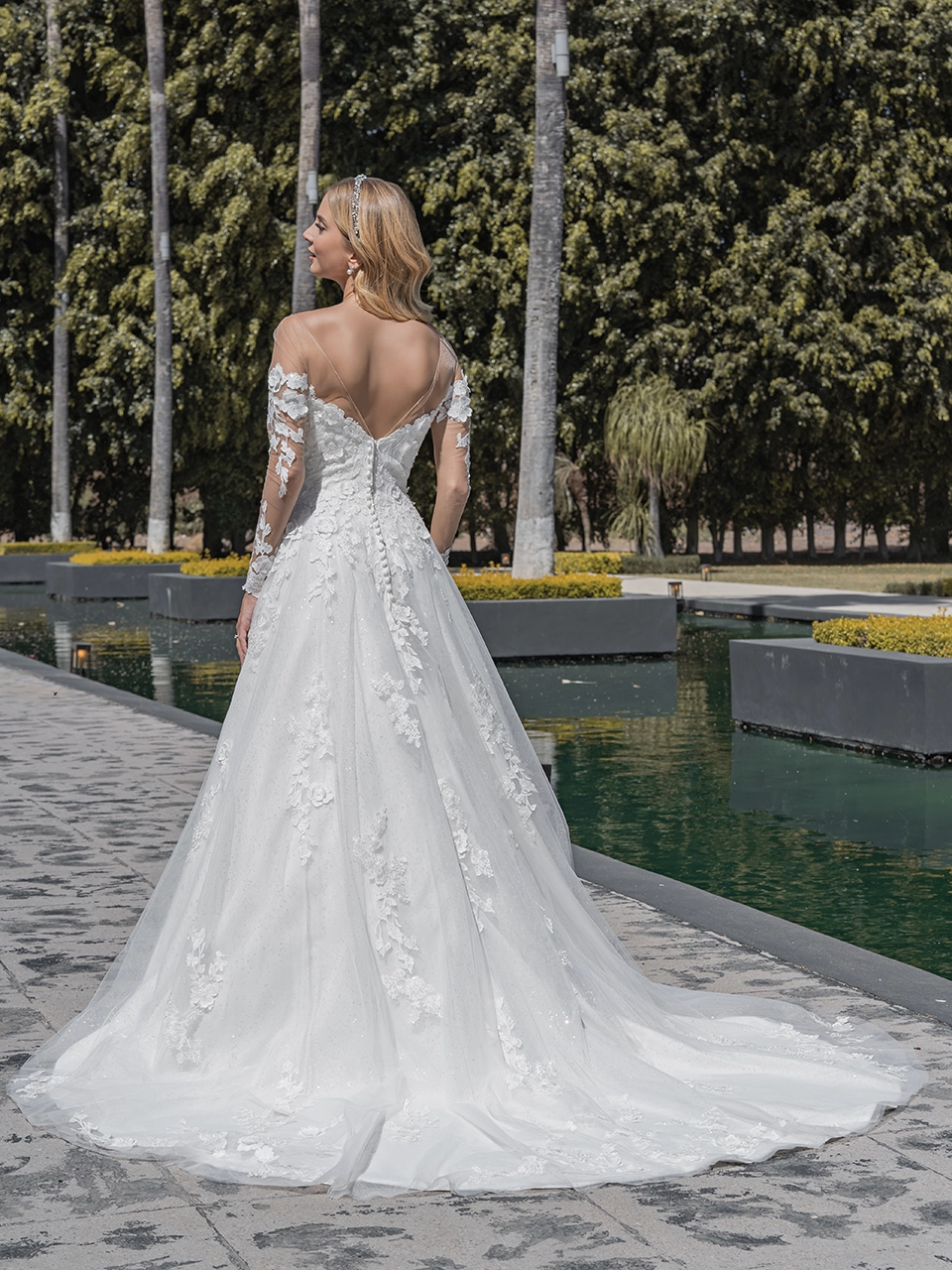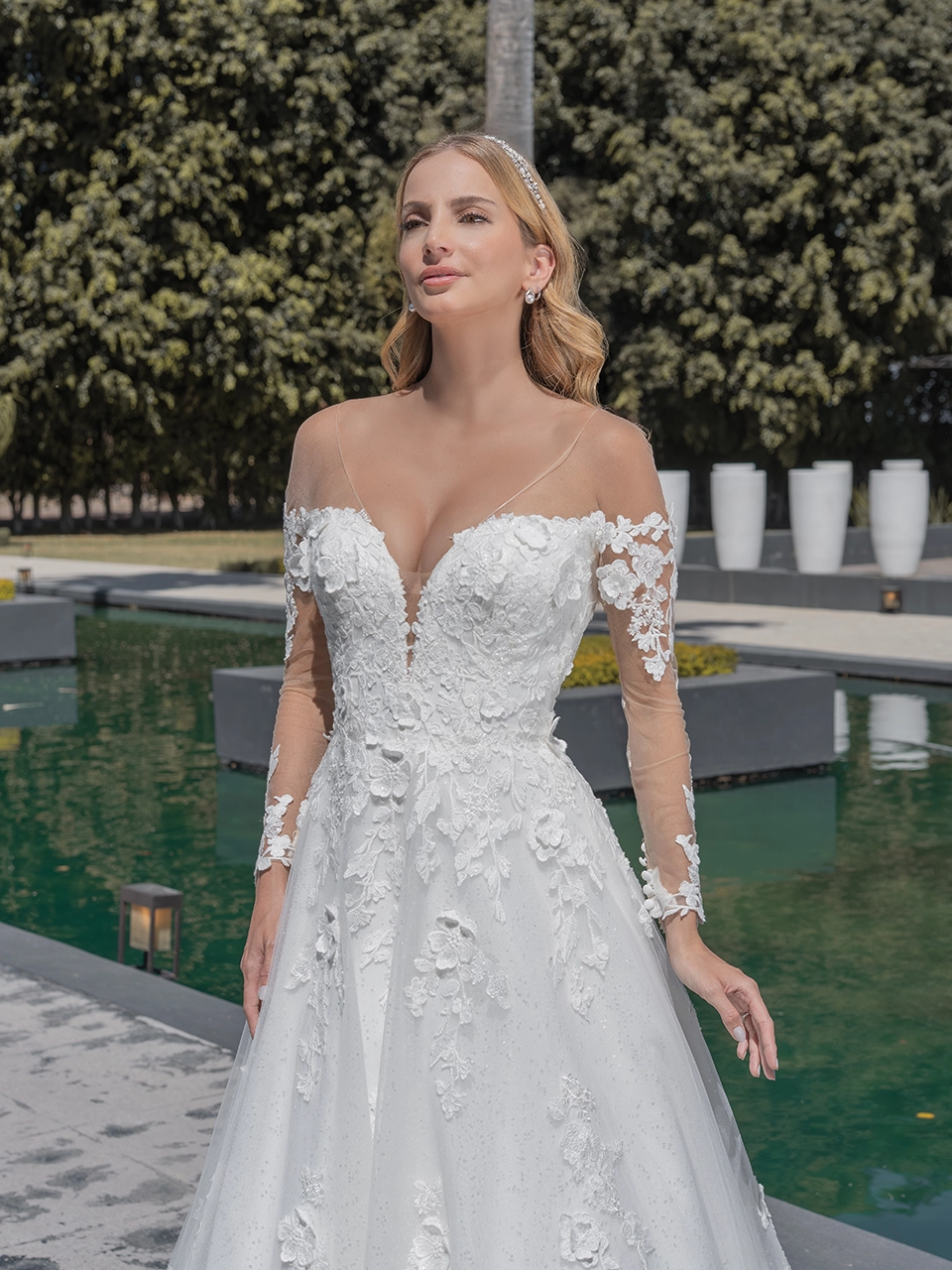VIOLETTE se convertirá en el vestido de tus sueños. Es un hermoso modelo corte línea A con un escote en forma de corazón. Está confeccionado en tul y lleva aplicaciones bordadas y en flores 3D que están en tendencia. Lleva manga larga con efecto ilusión, lo que te dará un toque único y especial en tu boda.