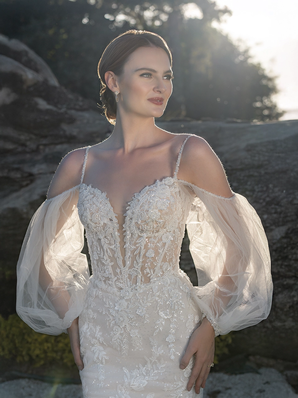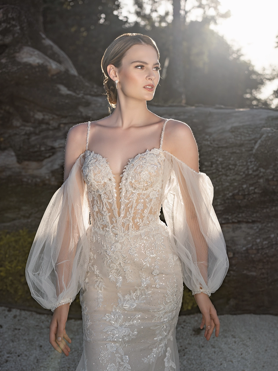 Vestido corte sirena, con escote en forma de corazón y mangas largas en forma de globo. Confeccionado en tul, lleva aplicaciones bordadas con detalles en pedrería y lentejuela.
